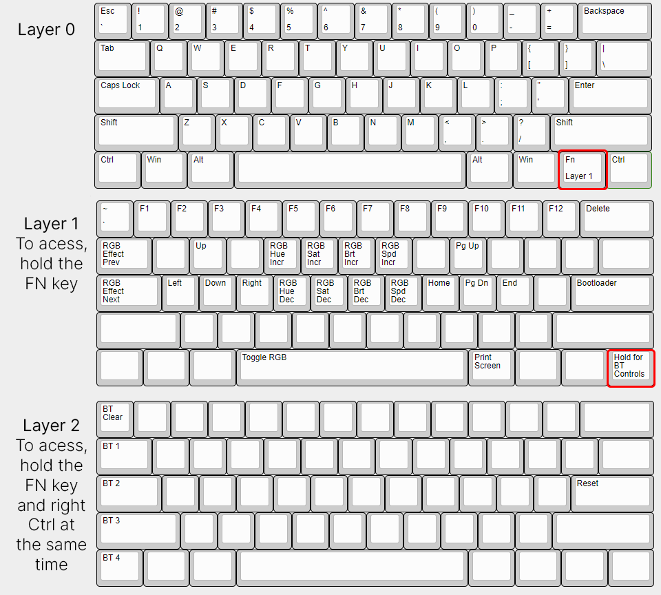 If you hold the FN key, and the right control key at the same time, you access Layer 2, also called the BT layer. This is where you adjust what device you're connected to, and initiate BT pairing.