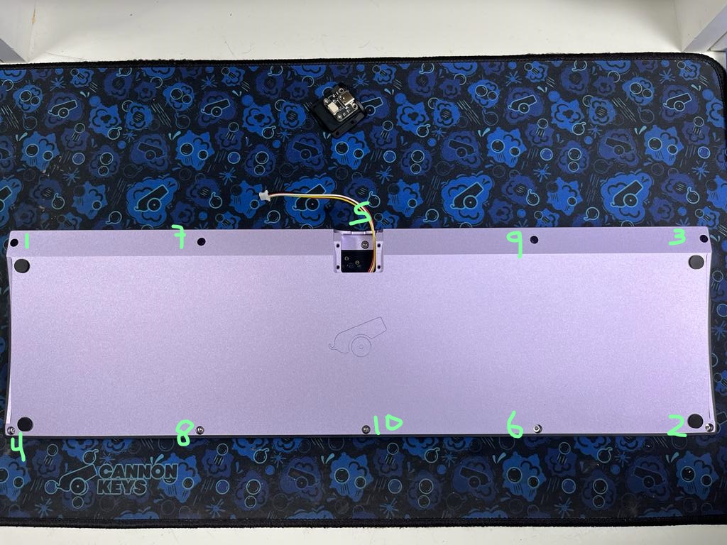 Flip the board to access the screw holes on the bottom. Use a little bit of force to compress the bottom and top together - you'll have to press down to get the gaskets to compress. Start screwing in the screws little by little, following the following photo. Only do a few turns of your screwdriver at a time. This will ensure we get even compression across the gaskets.
