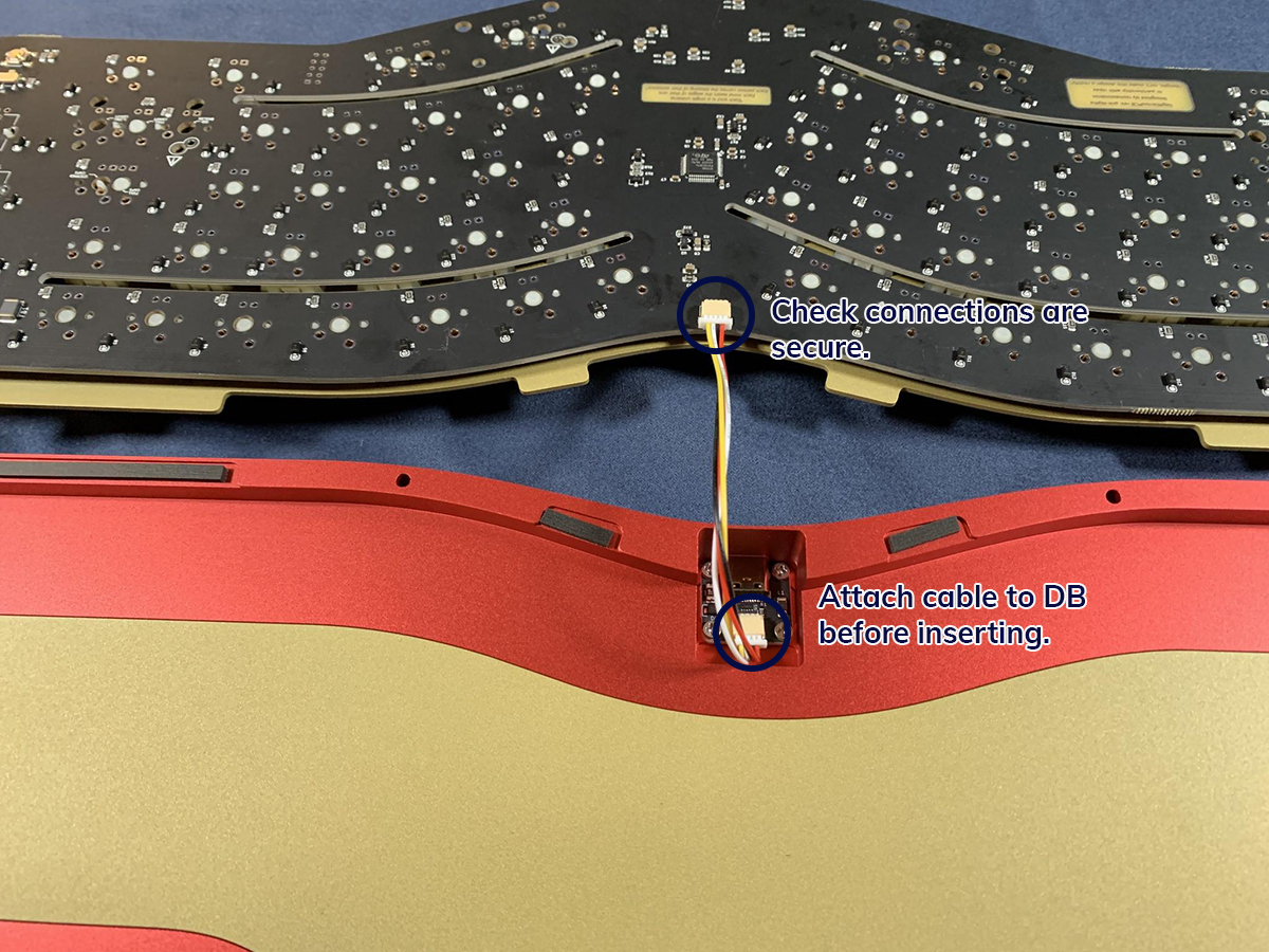 5. Gently place the PCB + plate assembly into the bottom case, making sure to carefully tuck the JST cable below the PCB. The plate should be sitting on the gaskets evenly, and wire tucked below PCB.