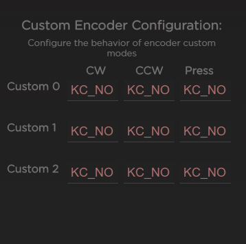 Each box controls a different behavior in the custom encoder mode, and can be defined with a QMK keycode.
