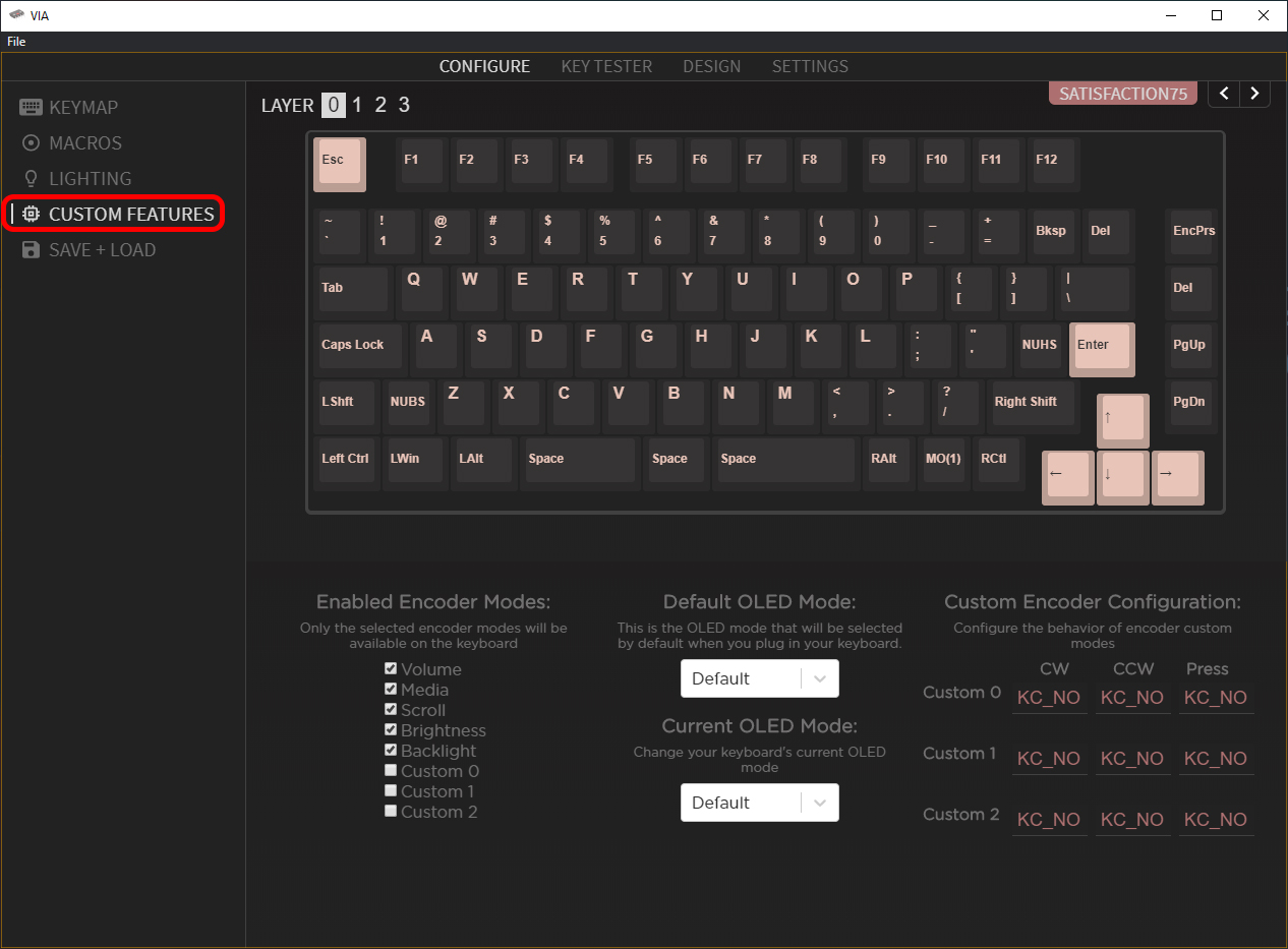 In addition to that, there is a special menu, made specifically for the Satisfaction75. From the default view, hit the "CUSTOM" header: