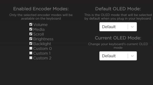From there, you can control the enabled encoder modes and default OLED mode: