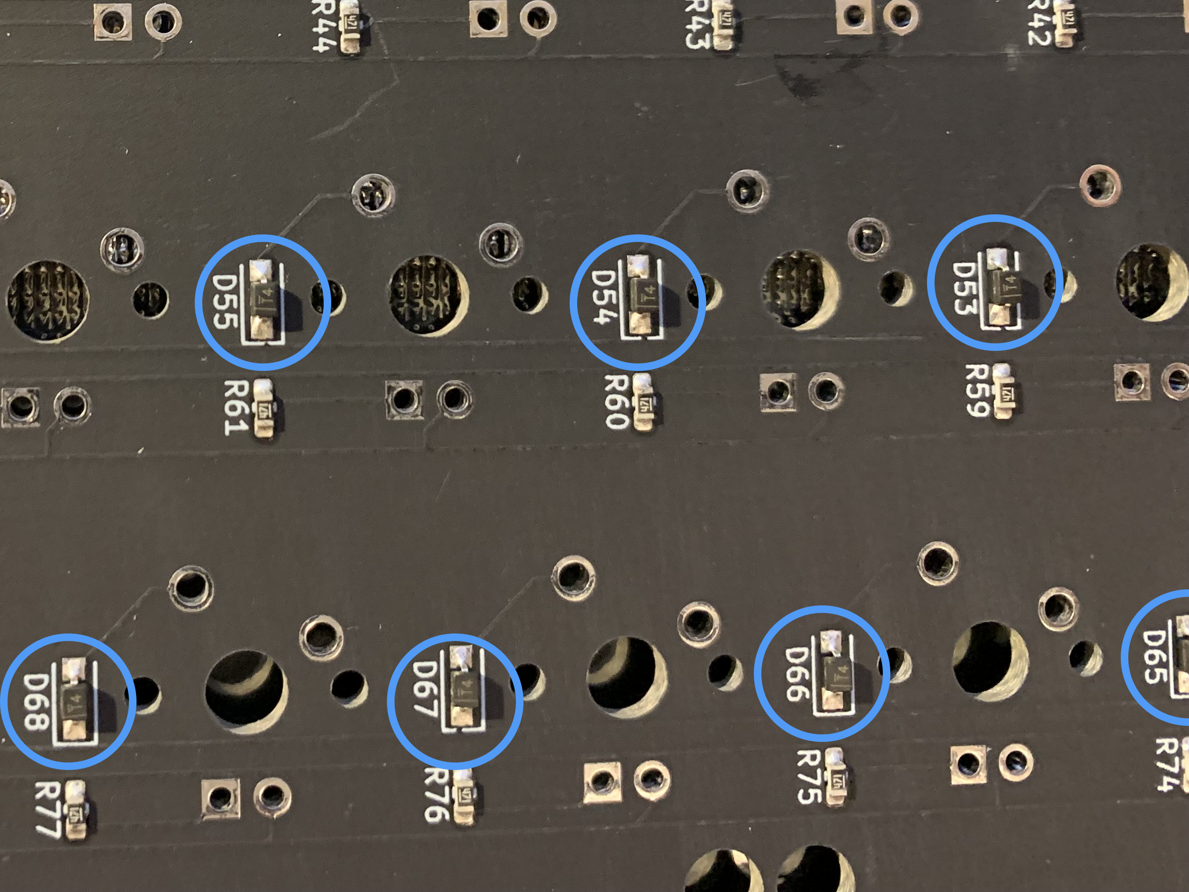 Above image shows diodes (circled in blue), and resistors (circled in green. The square and circle through holes south of switch cutouts are for single color LEDs.