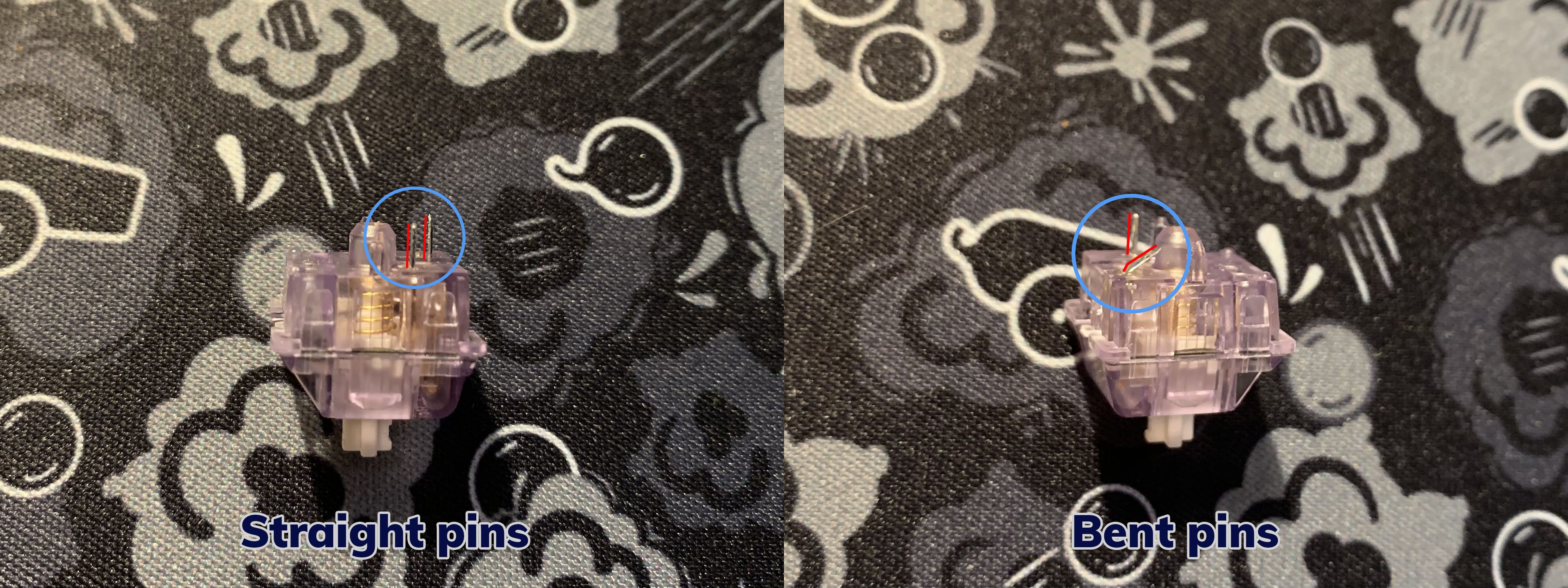 Left image: A lavender switch with straight pins. Right image: A lavender switch with a bent pin.